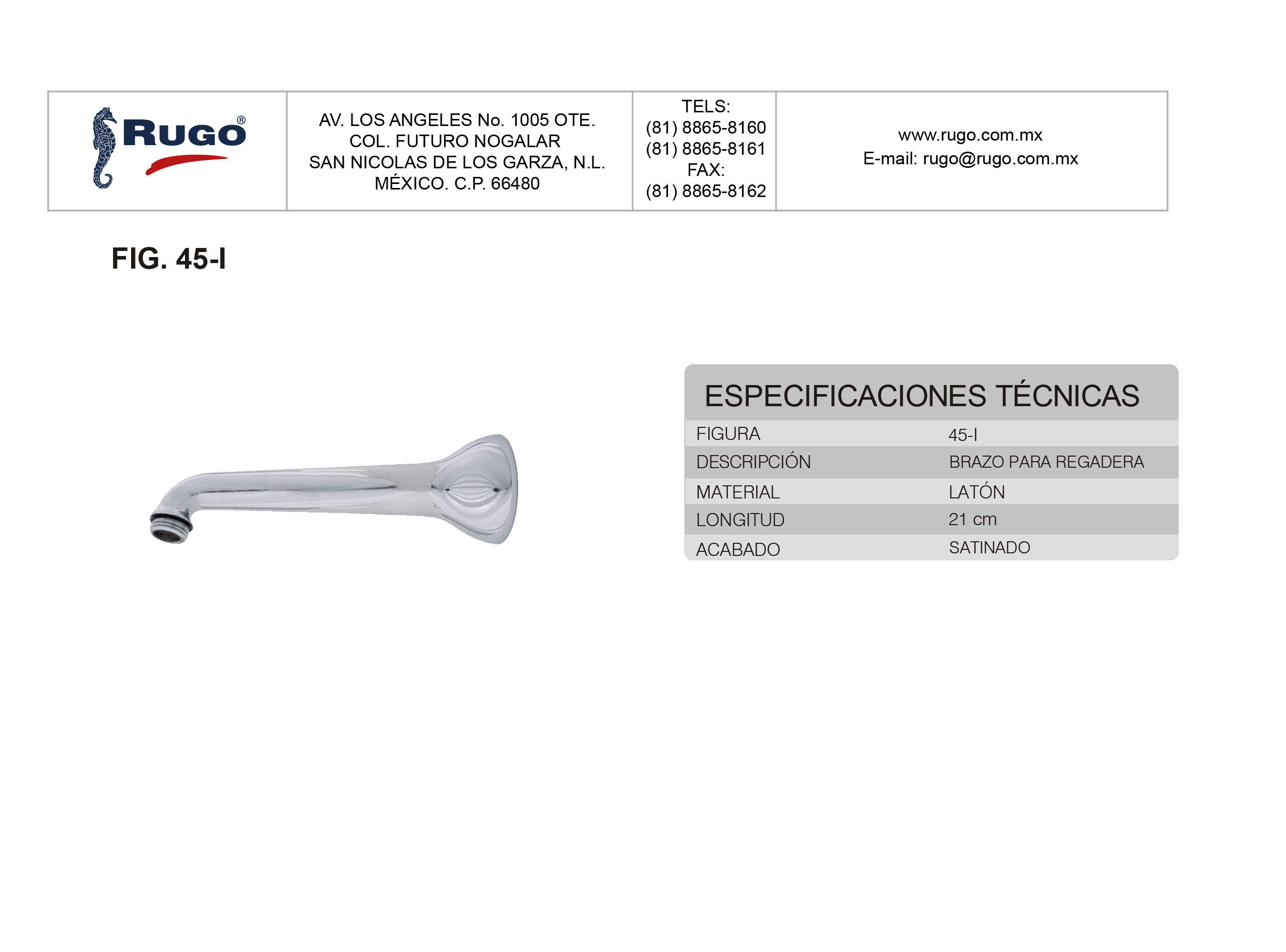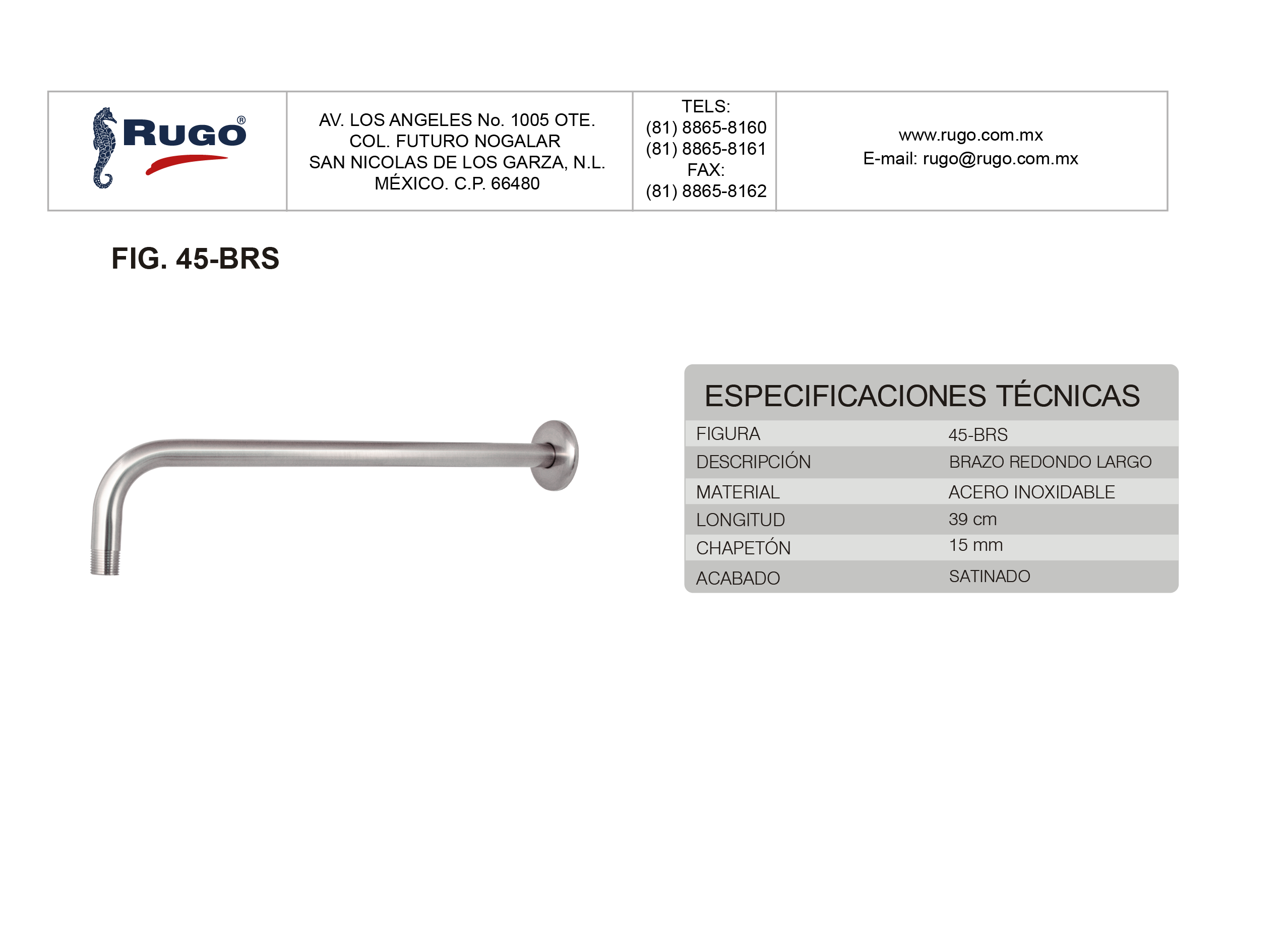 Brazo y Chapetón para Regadera de 39 cm de longitud | Acabado: Satinado