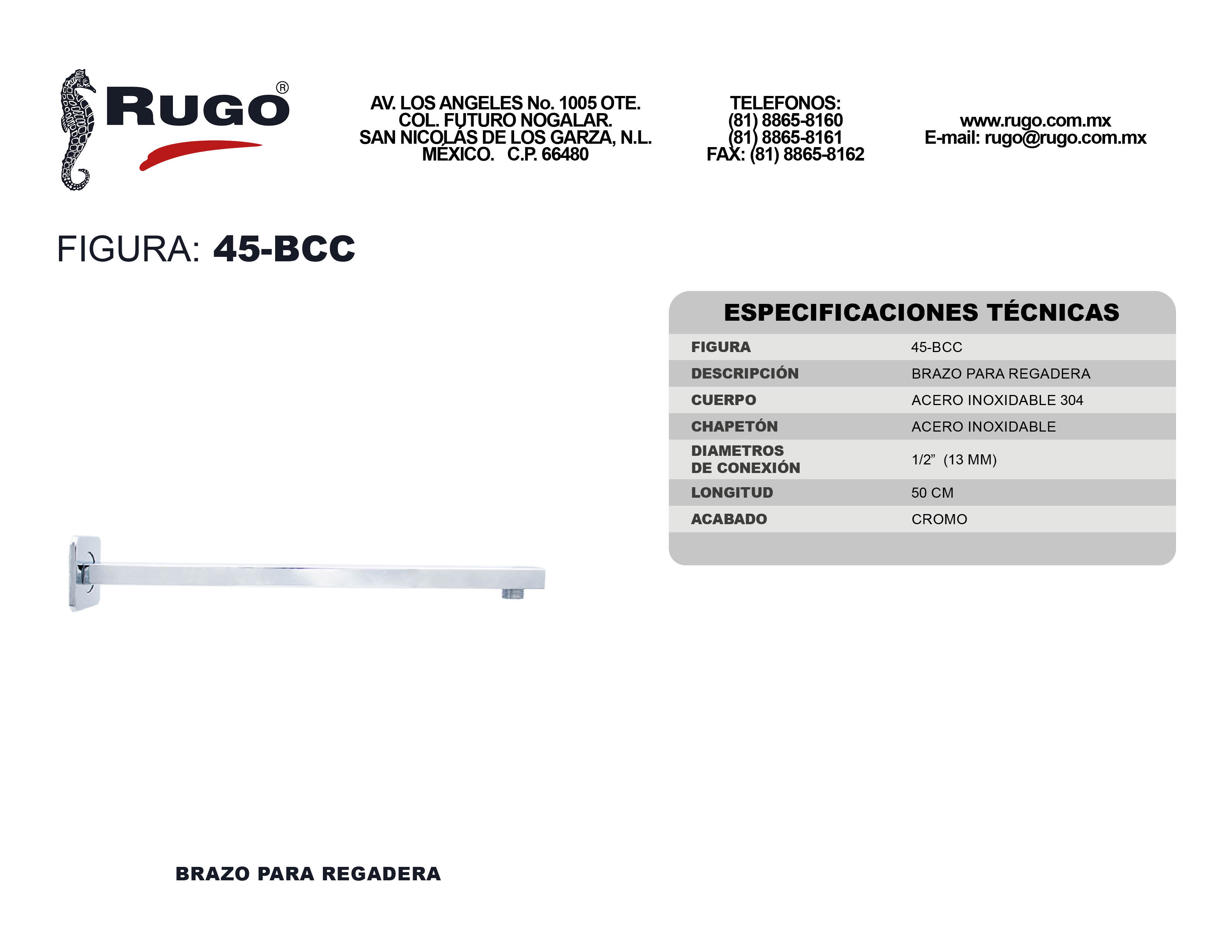 Brazo y Chapetón para Regadera de 50 cm de longitud | Acabado: Cromo
