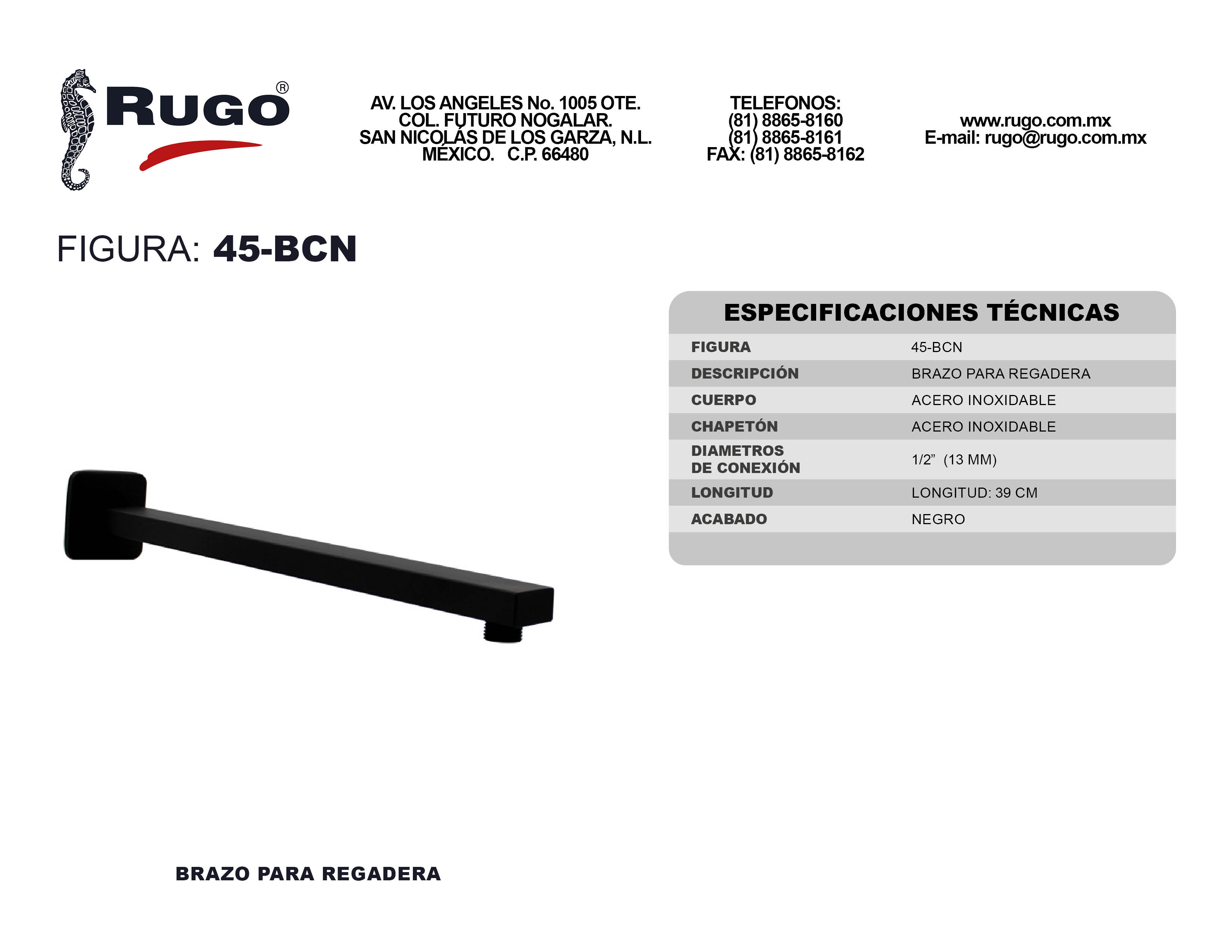 Brazo y Chapetón para Regadera de 39 cm de longitud | Acabado: Negro