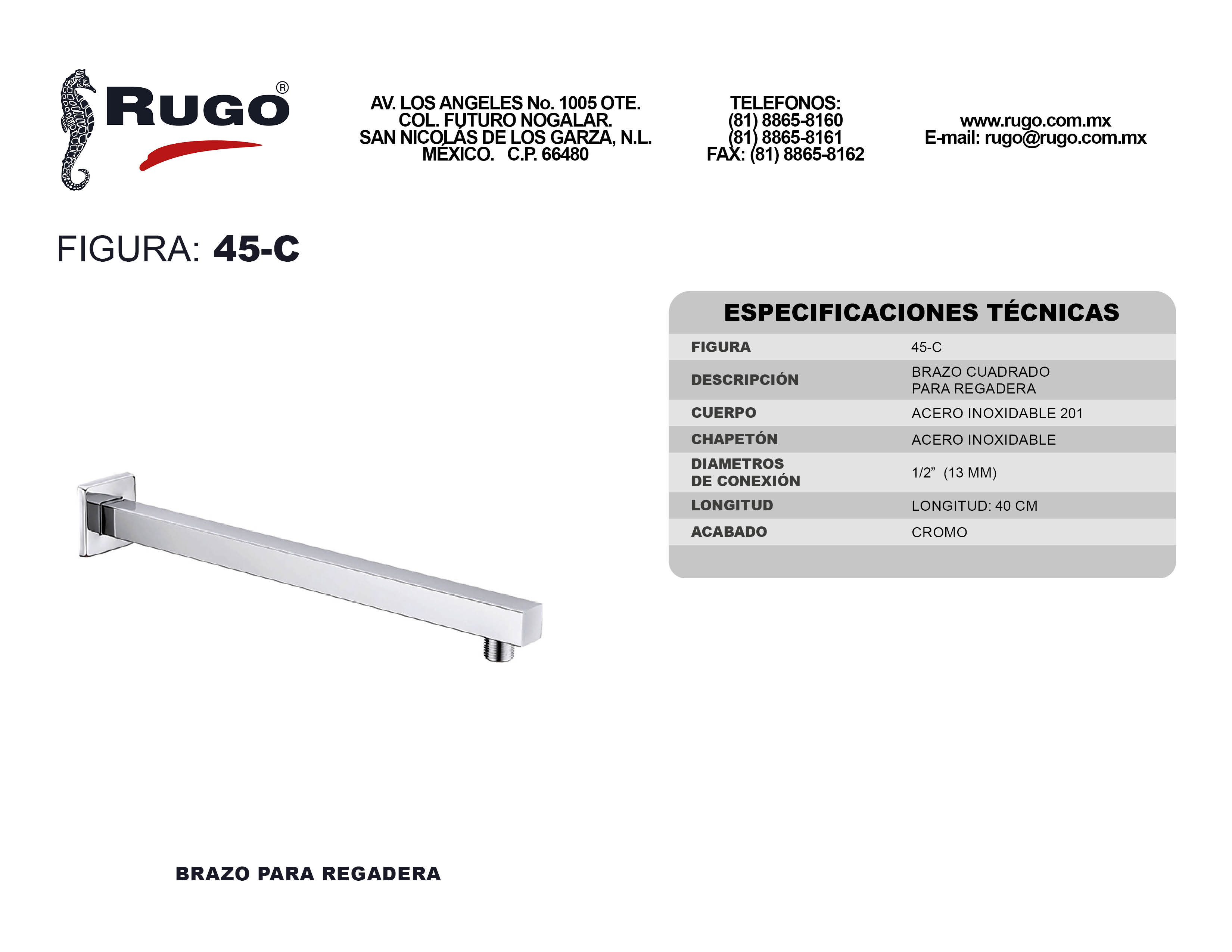Brazo y Chapetón para Regadera de 40 cm de longitud | Acabado: Cromo